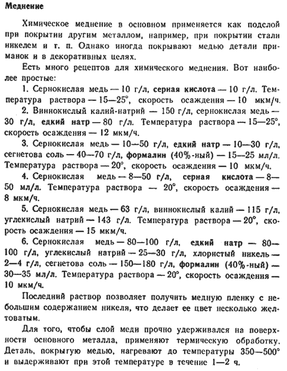 При перемешивании добавить в р-р 200 мл 40% формалина и сразу же опускается омедняемая деталь. Выдержка 10=12 мин. Расстояние между деталями не менее 10-15 см. |